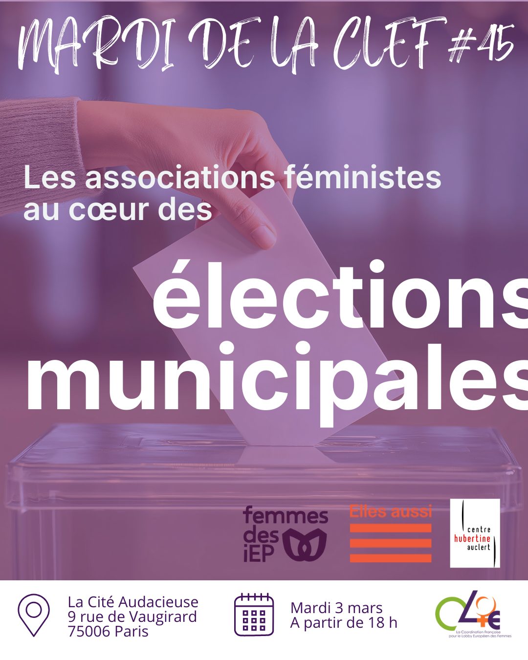 Alors que les élections municipales des 15 et 22 mars approchent, la CLEF vous invite au Mardi de la CLEF : “Les associations féministes au cœur des élections municipales.”